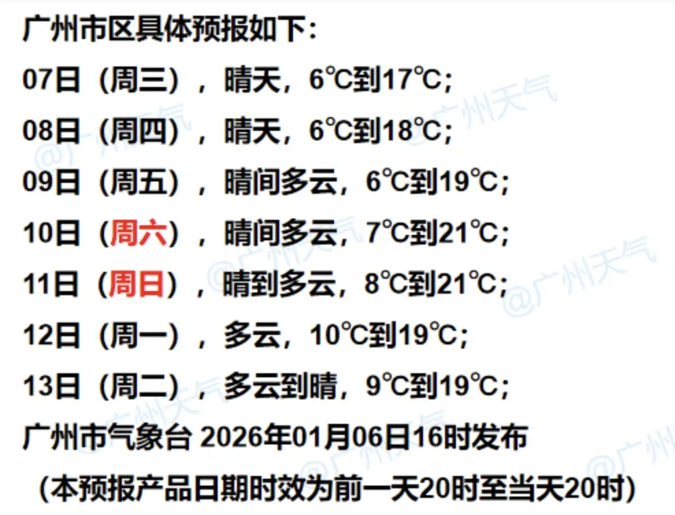广州市气象台1月6日傍晚市区七天预报。图源:@广州天气